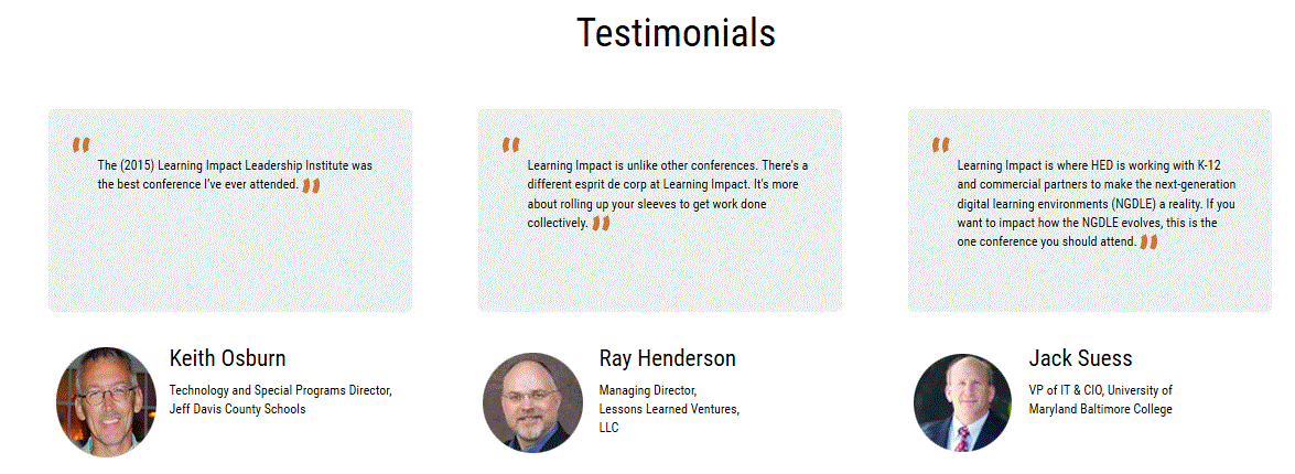 However, the web page you highlighted above was the “First Wave” of speakers in a very limited part of the program. Since the message was sent we have added four additional speakers and will continue to add new speakers right up until the Learning Impact Leadership Institute (LILI) https://www.imsglobal.org/2016-learning-impact-leadership-institute.